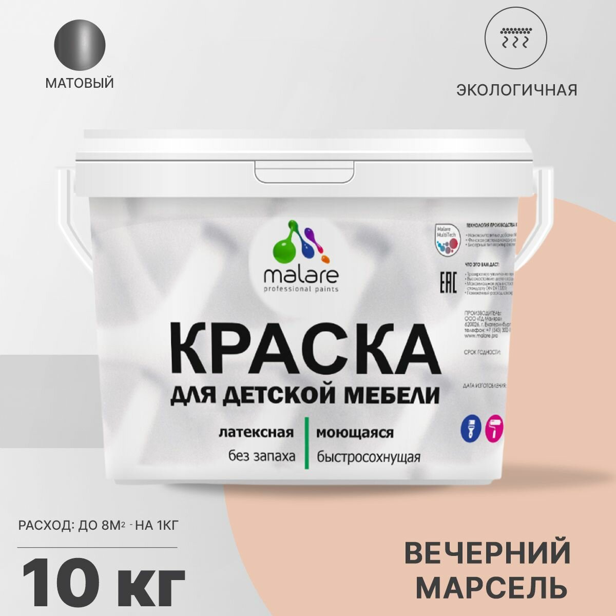 СохранитьКраска Malare для детской мебели, кухонных фасадов, дерева, латексная эластичная моющаяся, быстросохнущая матовая, вечерний марсель, 10 кг. интересное: