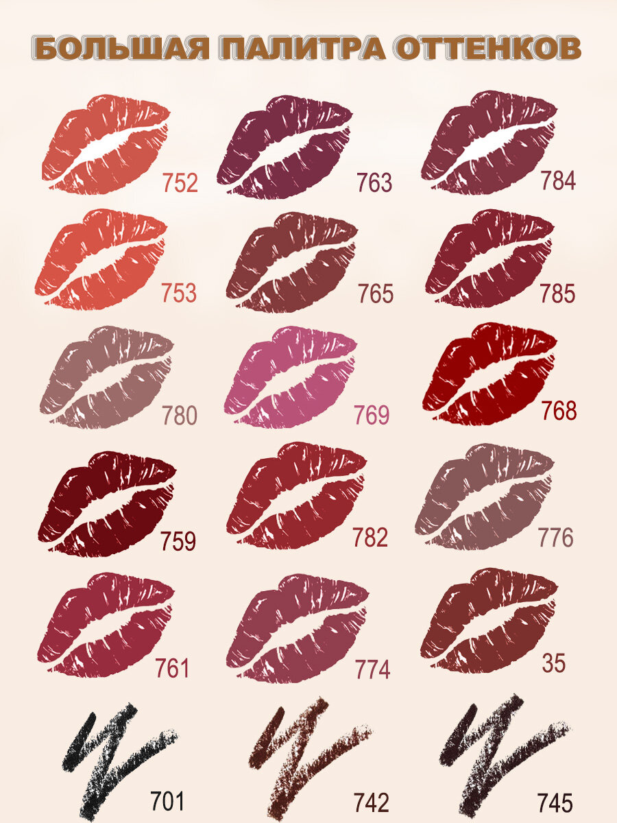 Карандаш для губ, стойкий цвет, мягкое нанесение, не сушит губы оттенок 774.