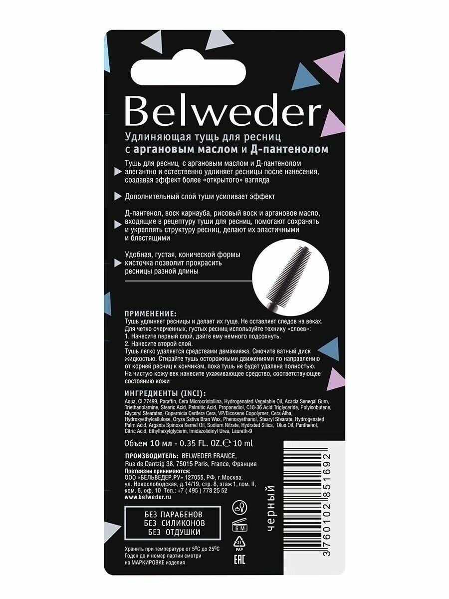 BELWEDER, Удлиняющая тушь для ресниц с аргановым маслом и Д-пантенолом - черный