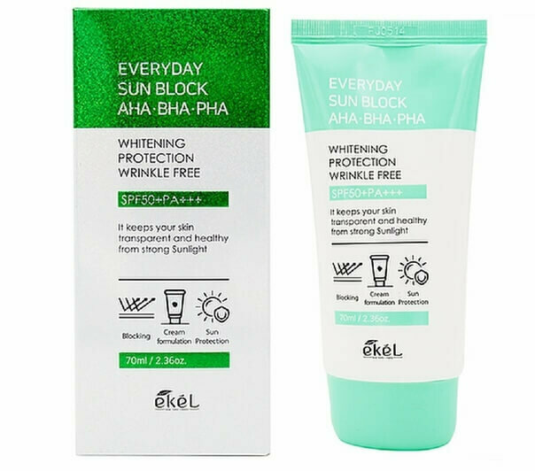 Купить Солнцезащитный крем EKEL Everyday Sun Block AHA BHA PHA SPF 50PA+++, 70 мл / идеально для чувствительной и проблемной кожи