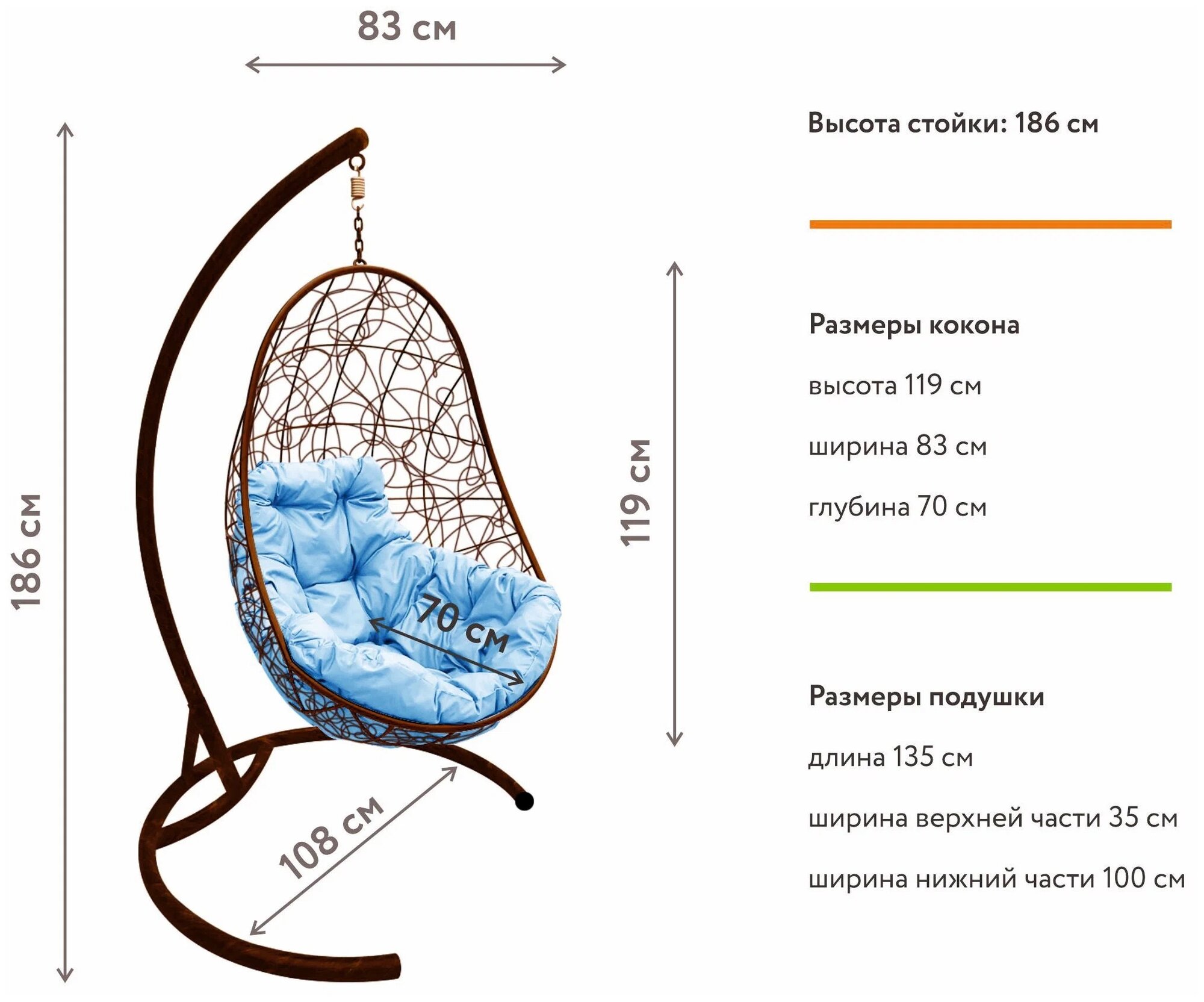 Кокон местами облез, оплётка с желтизной, про непрокрасы молчу! Единственный плюс подушка, действительно на вид хорошая Кроме того не указан размер основания, специально приобретался узкий кокон 84см зато основание 104см! Теперь не помещается на балконе |