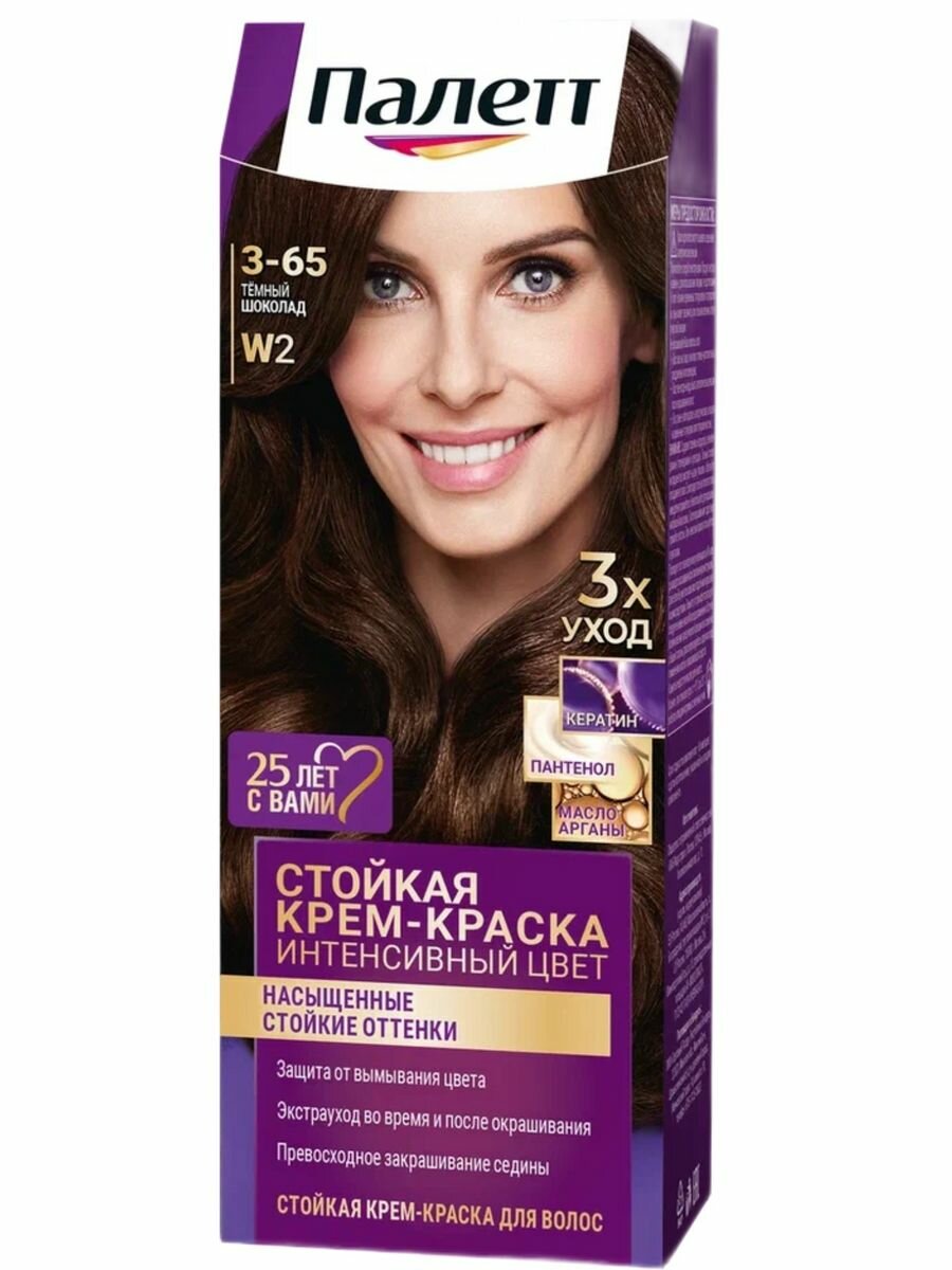 Палетт Стойкая крем-краска Интенсивный цвет, W2 3-65 Темный шоколад, 110 мл - 3 шт