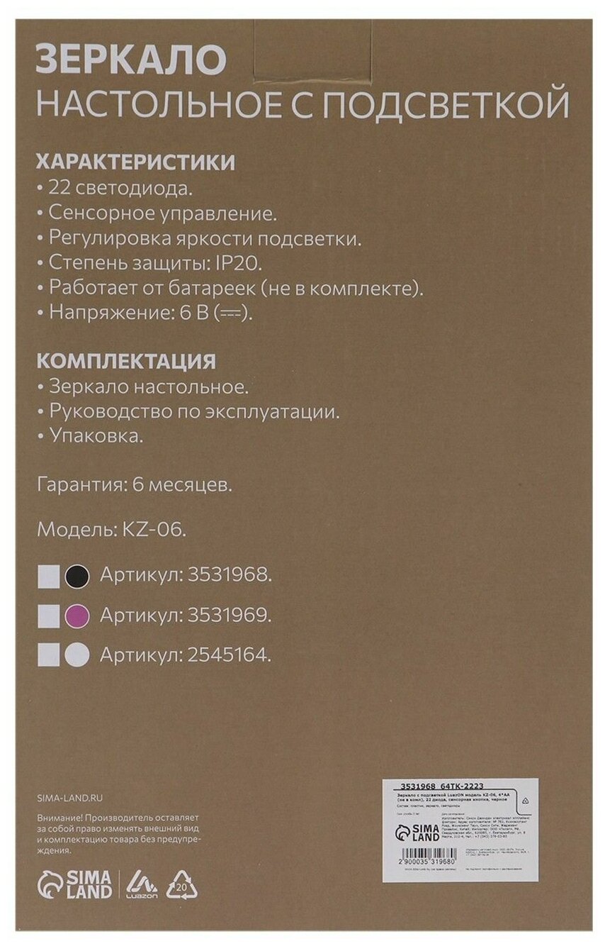 Luazon зеркало косметическое настольное KZ-06 зеркало косметическое настольное KZ-06 с подсветкой, белый