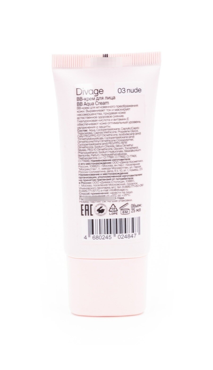 Диваж BB-крем для лица BB Aqua Cream для любого типа кожи кремовый 03 nude с гиалуроновой кислотой и витамином Е 25мл / декоративная косметика
