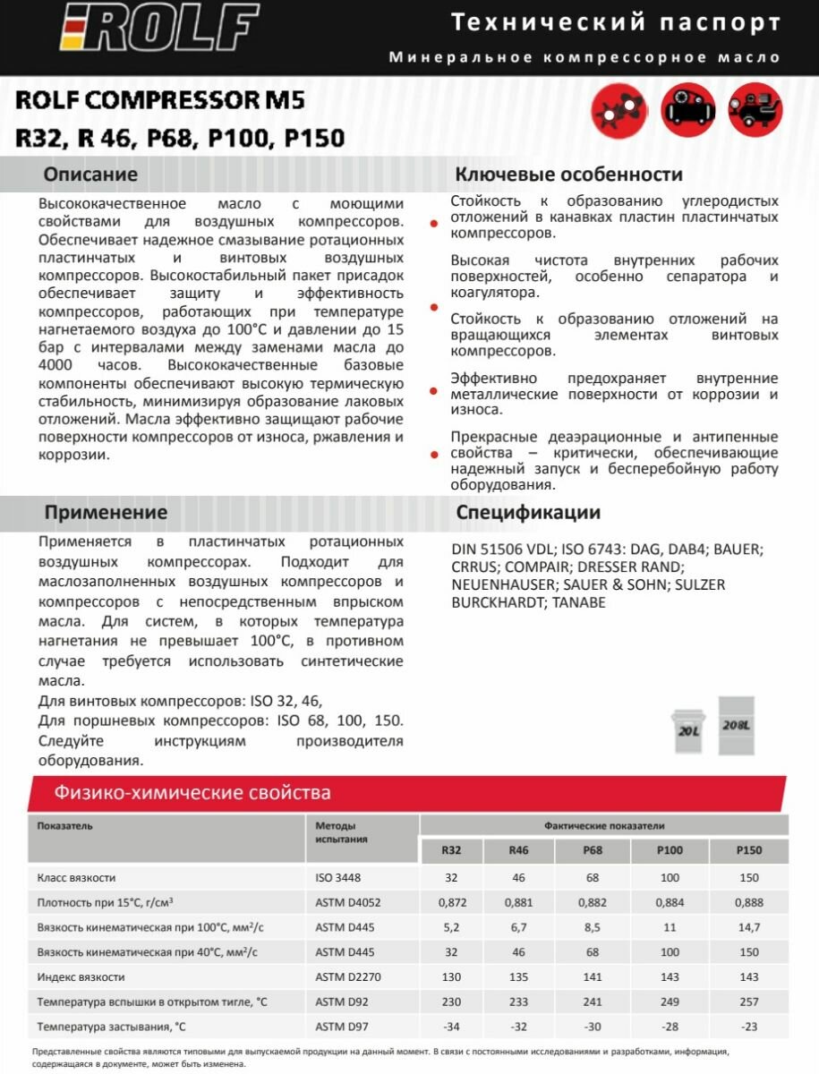 ROLF COMPRESSOR M5 P 100 20л. масло компрессорное DIN 51506 VDL ISO 6743-3 интересное: