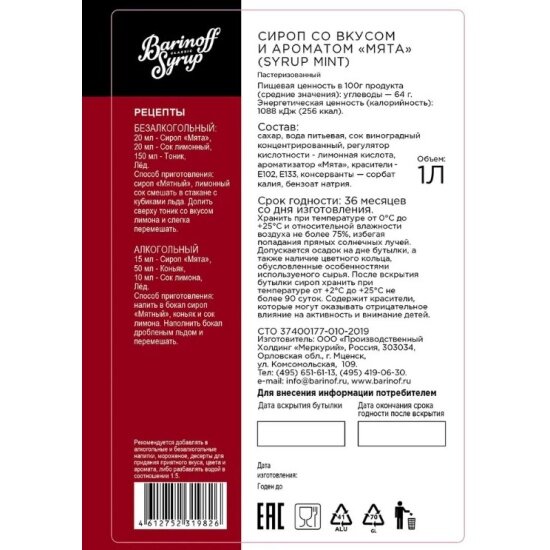 Сироп Barinoff Мята, для кофе и коктейлей, 1 л интересное: