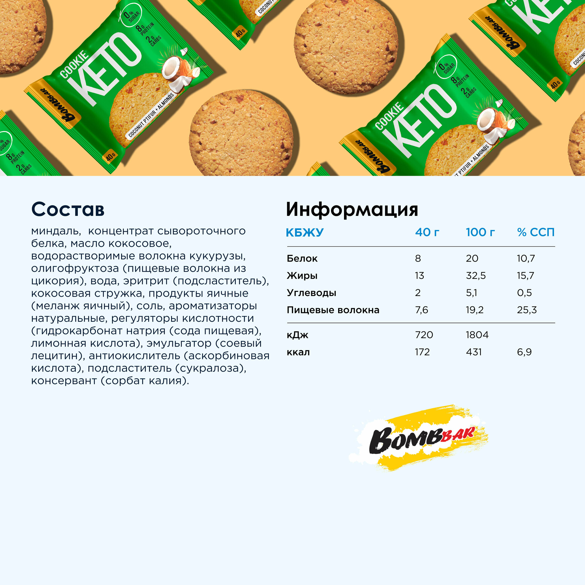Bombbar Keto Cookie 40 г (коробка 12 шт) Кокос-миндаль