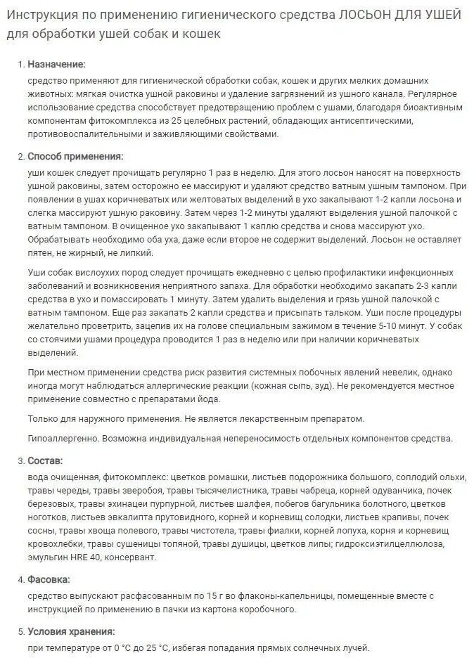 | Способ применения | уши кошек следует прочищать регулярно 1 раз в неделю. Для этого лосьон наносят на поверхность ушной раковины, затем осторожно ее массируют и удаляют средство ватным ушным тампоном. При появлении в ушах коричневатых или желтоватых выделений в ухо закапывают 1-2 капли лосьона и слегка массируют ушную раковину. Затем через 1-2 минуты удаляют выделения ушной палочкой с ватным тампоном. В очищенное ухо закапывают 1 каплю средства и снова массируют ухо. Обрабатывать необходимо оба уха, даже если второе не содержит выделений. Лосьон не оставляет пятен, не жирный, не липкий. Уши собак вислоухих пород следует прочищать ежедневно с целью профилактики инфекционных заболеваний и возникновения неприятного запаха. Для обработки необходимо закапать 2-3 капли средства в ухо и помассировать 1 минуту. Затем удалить выделения и грязь ушной палочкой с ватным тампоном. Еще раз закапать 2 капли средства и присыпать тальком. Уши после процедуры желательно проветрить, зацепив их на голове специальным зажимом в течение 5-10 минут. У собак со стоячими ушами процедура проводится 1 раз в неделю или при наличии коричневатых выделений |