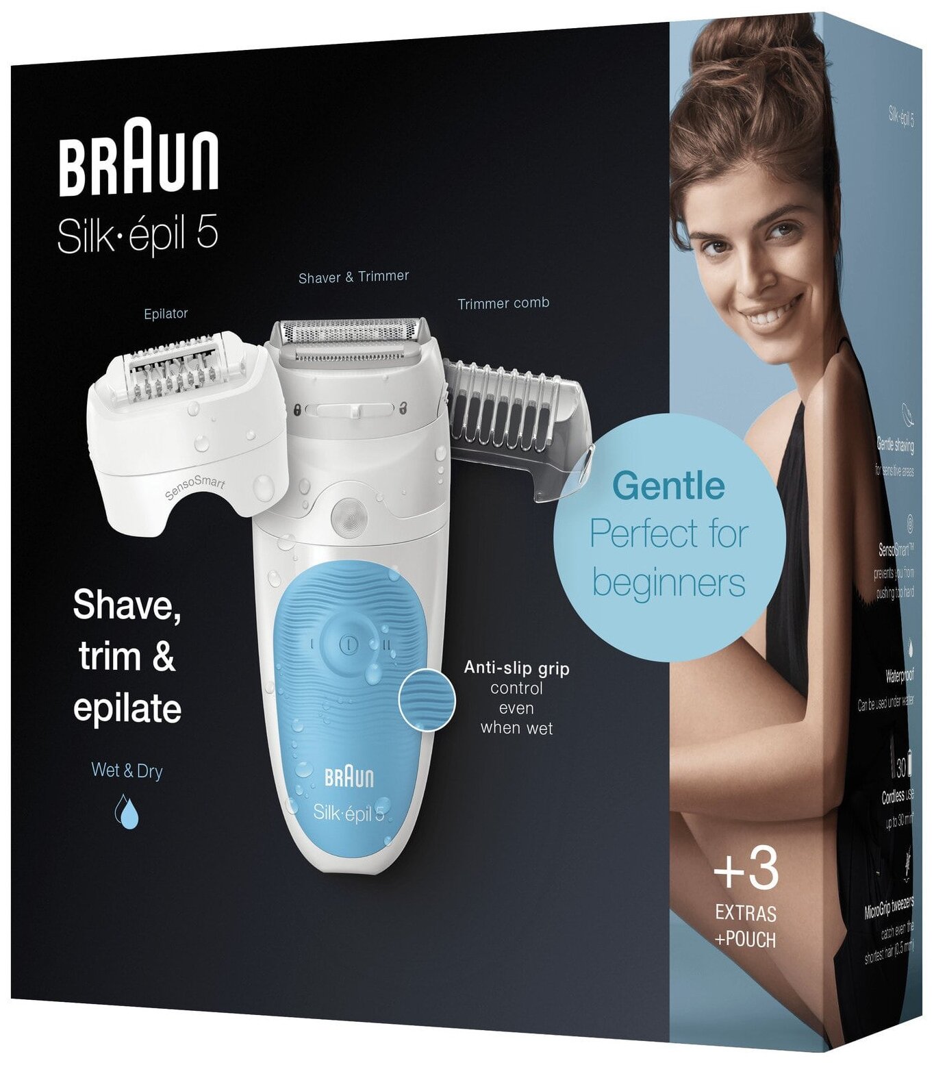 Эпилятор женский Braun Silk-epil 5 5-605, для сухой и влажной эпиляции, 3 насадки, белый/голубой