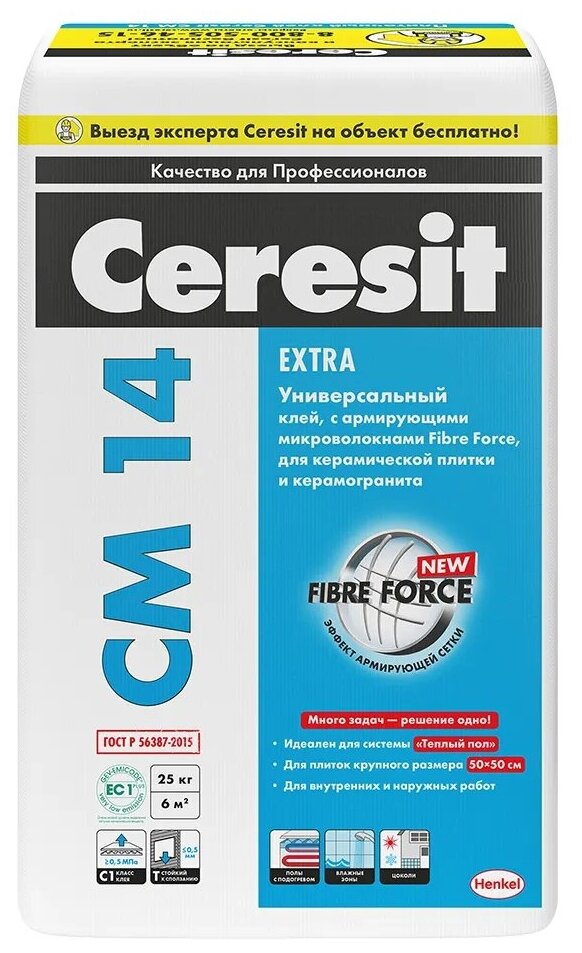 Клей CERESIT CM 14 EXTRA, для крепления плитки и керамогранита, 25 кг