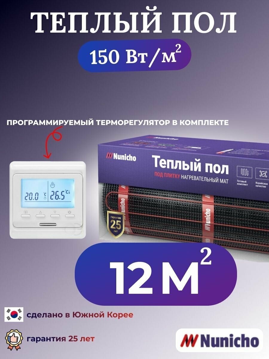 Теплый пол электрический под плитку Nunicho 12 м2 с программируемым белым терморегулятором в комплекте