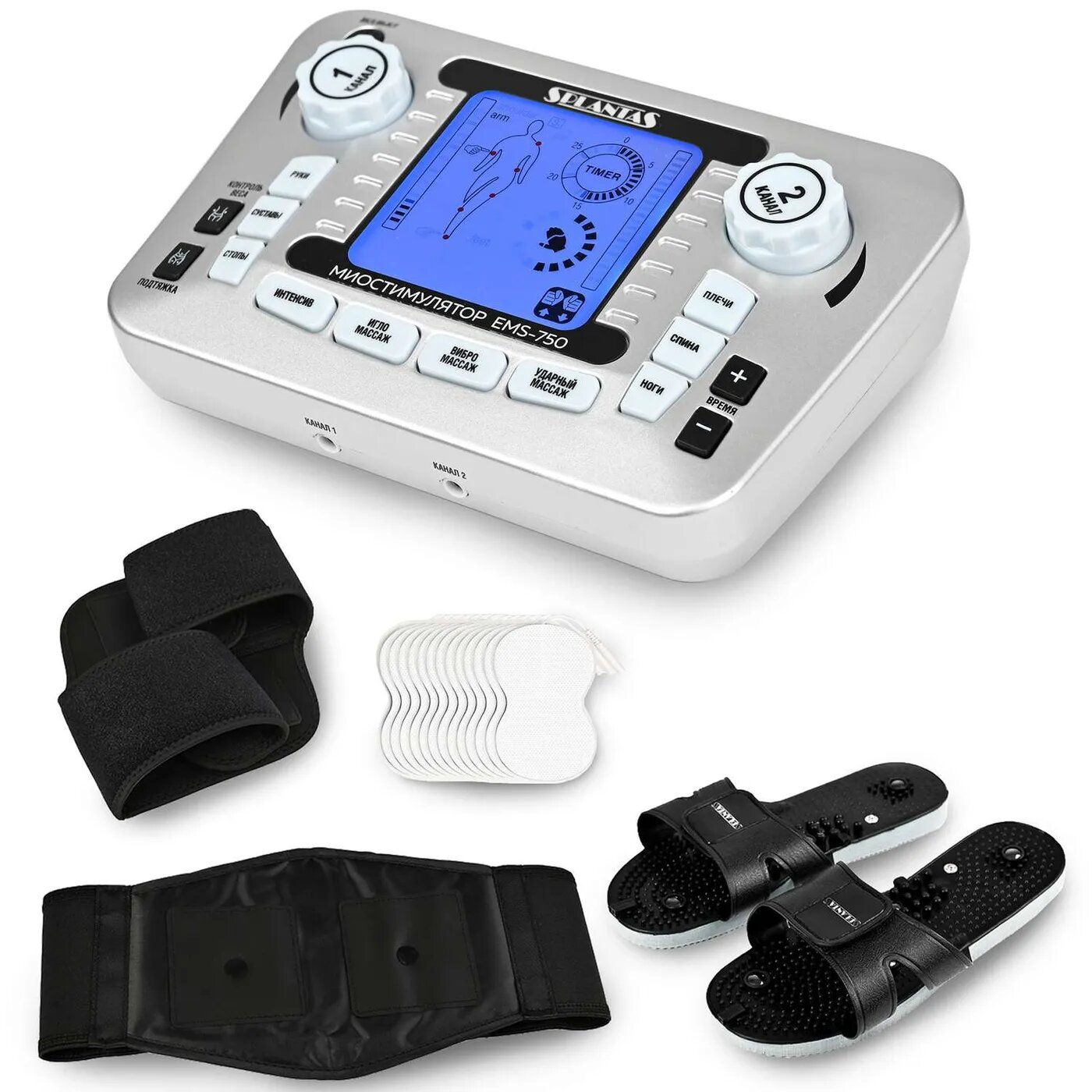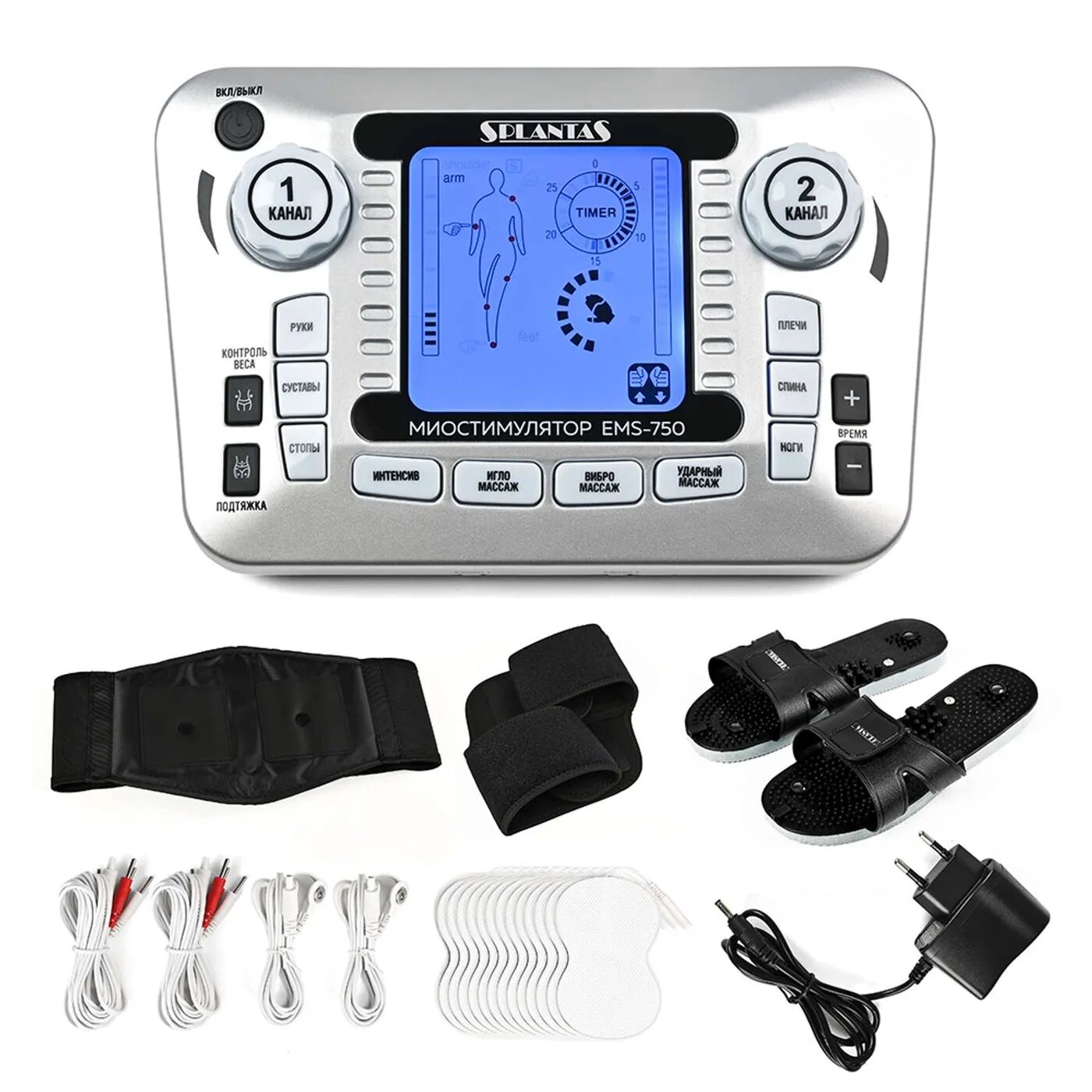 Купить PLANTA Массажер - миостимулятор с профессиональным набором аксессуаров EMS-750, 8 электродов, пояс, наколенник и тапочки в комплекте