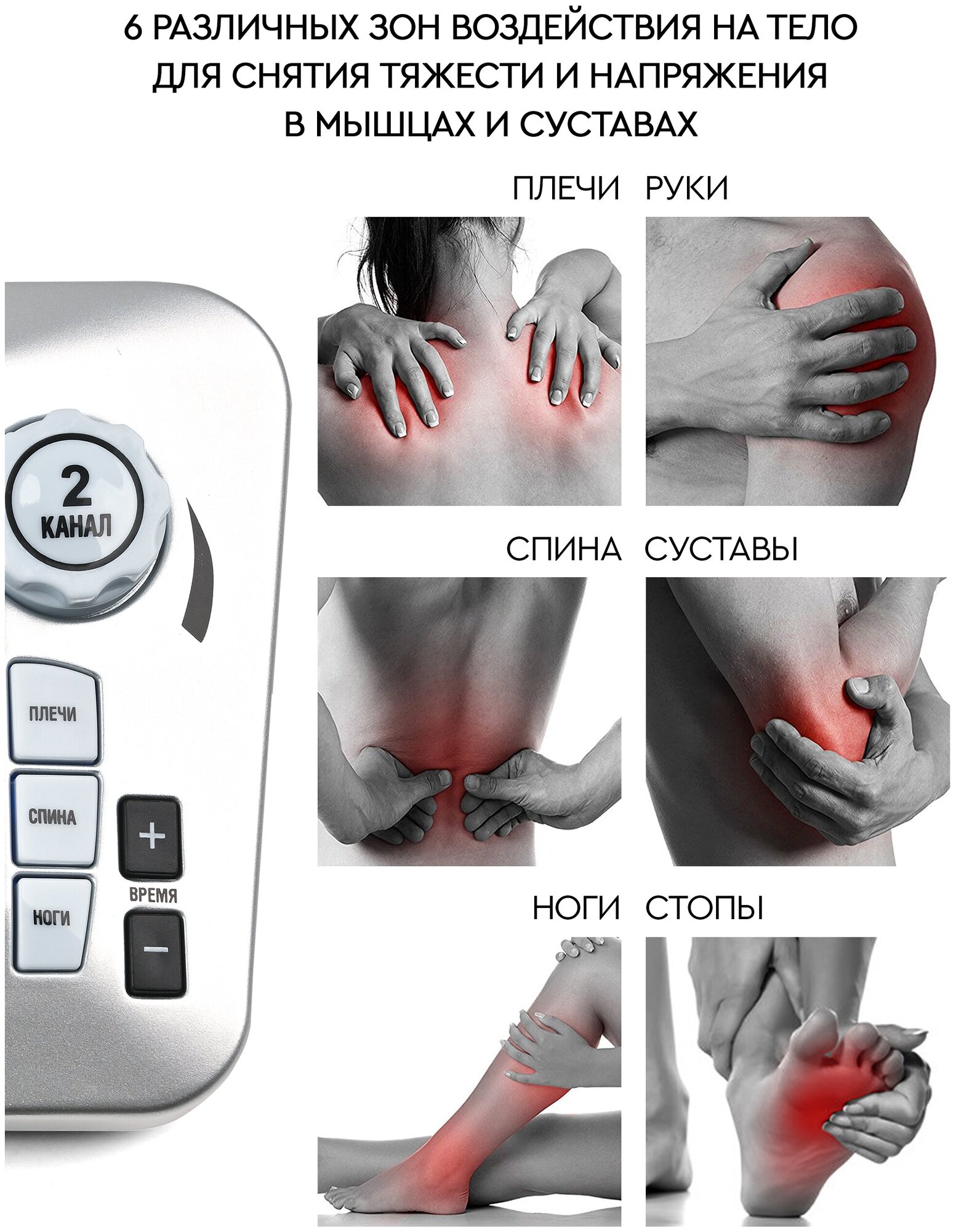 Одновременно можно использовать 8 электродов, регулировка мощности подачи импульсов, количество аксессуаров