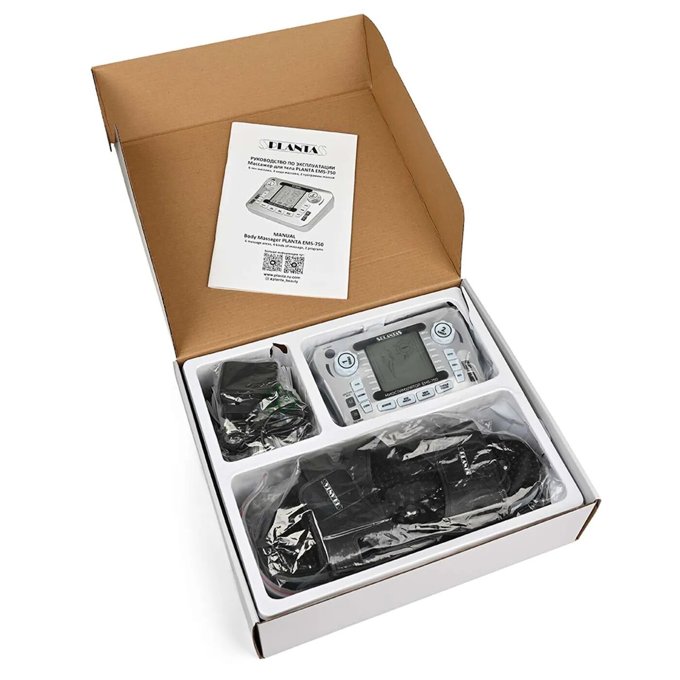 PLANTA Массажер - миостимулятор с профессиональным набором аксессуаров EMS-750, 8 электродов, пояс, наколенник и тапочки в комплекте интересное: