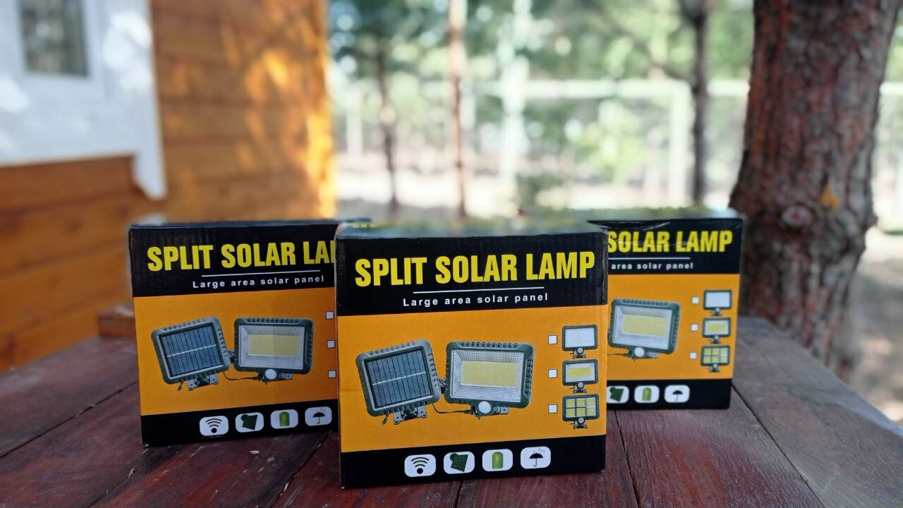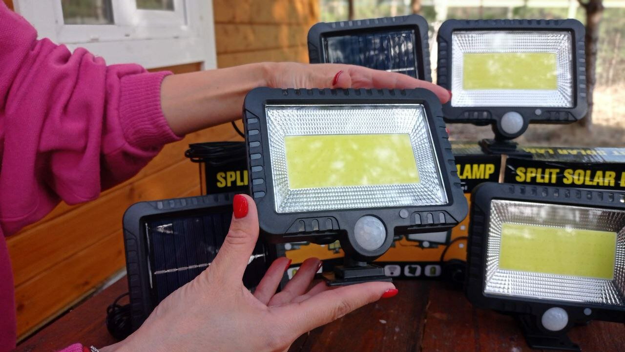 Три штуки. Светодиодные прожектора с датчиком движения на солнечной батарее.