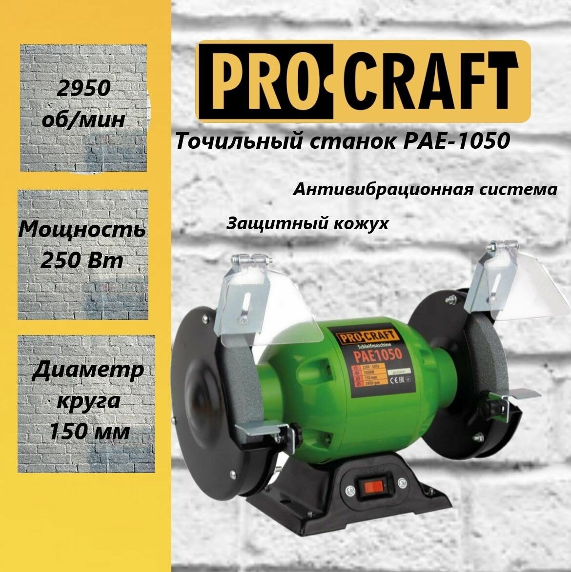 Точильный станок Procraft PAE-1050, диск 150, 250 Вт, 2950 об/мин