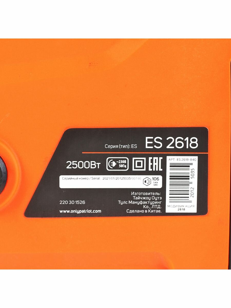 PATRIOT Пила цепная электрическая PATRIOT ES 2618 220301526 {2.5кВт,18' шина, продольный двигатель, плавный пуск, бесключевая натяжка цепи}