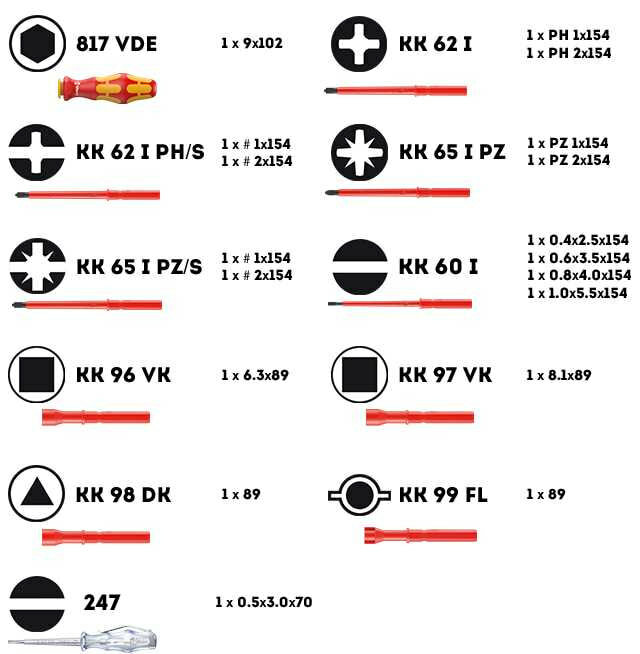 | Отвертки подробно | SL5.5, SL2.5, SL3.5, SL4, PH1, PH2, PH/SL1, PH/SL2, PZ1, PZ4, PZ/SL1, PZ/SL2, Q6.3, Q8.1 и др.; тестер: SL3x70 |