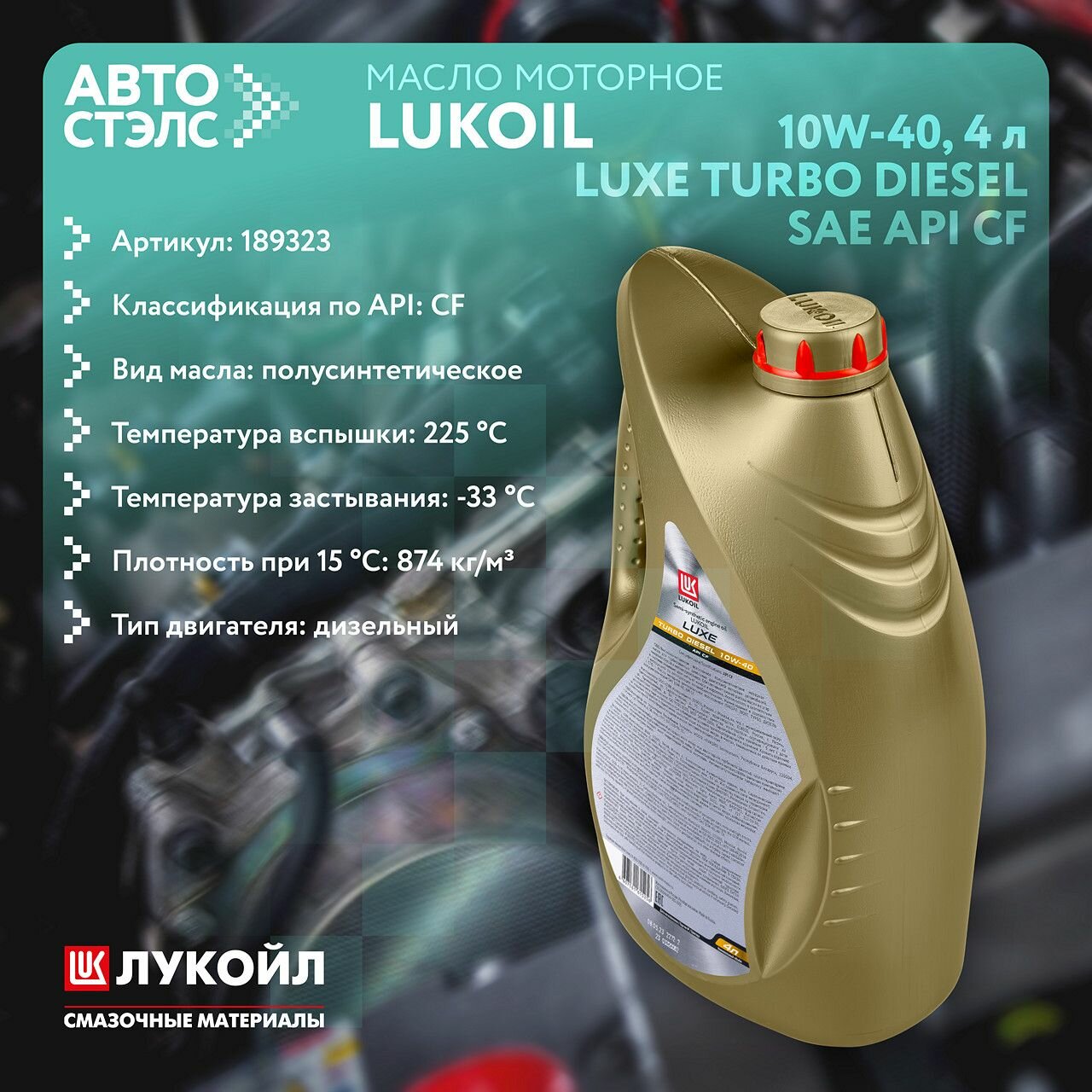 LUKOIL 189323 Масло моторное Лукойл Люкс Турбо Дизель CF 10W40 полусинтетическое 4 л 189323 1шт
