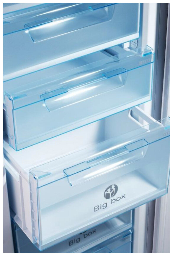 | Плюсы: | Узкий, вместительный, ящики цельнолитые, прозрачные. Есть узкий ящик для ягод, пельменей |
