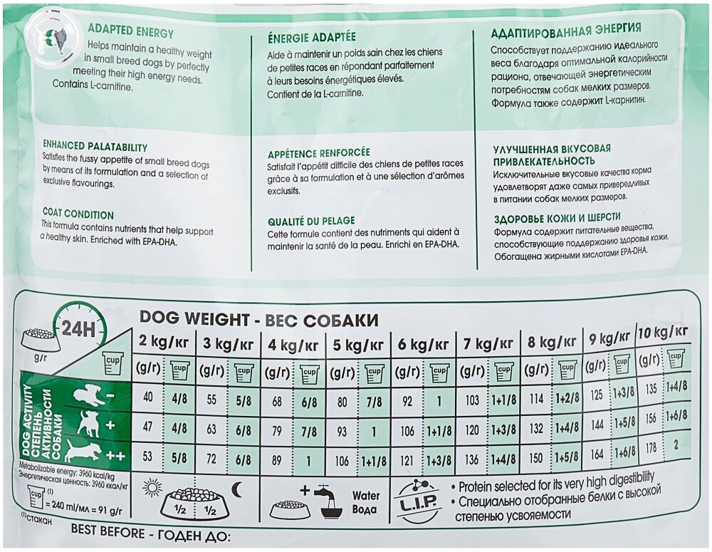 | Состав | рис, дегидратированные белки животного происхождения (птица), мука из зерновых культур, изолят растительных белков, пшеница, животные жиры, гидролизат белков животного происхождения (вкусоароматические добавки), растительная клетчатка, минеральные вещества, рыбий жир, соевое масло, дрожжи и побочные продукты брожения, фруктоолигосахариды |