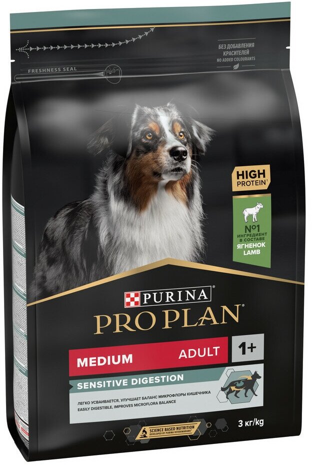 Сухой корм Pro Planдля взрослых собак средних пород с чувствительным пищеварением, с высоким содержанием ягненка, Пакет, 3 кг х 1 шт