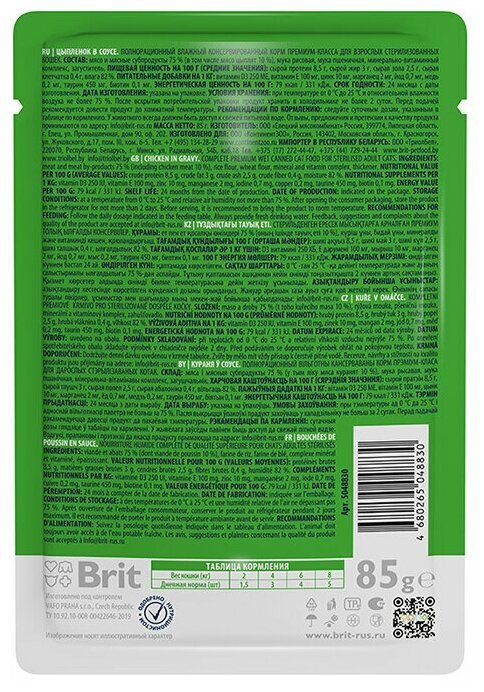 BRIT PREMIUM CAT CHICKEN SLICES FOR STERILISED д кастрир и стер кош с курицей в соусе пауч 85 гр 85 гр х 4 шт