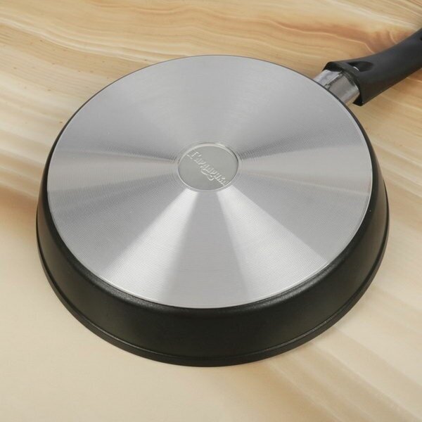 | Плюсы: | Хорошая недорогая сковорода. Дно и стенки толстые, это не жестянка "каждый день", которую можно руками в рулон свернуть. У нее точно не выгнется дно вовнутрь. |