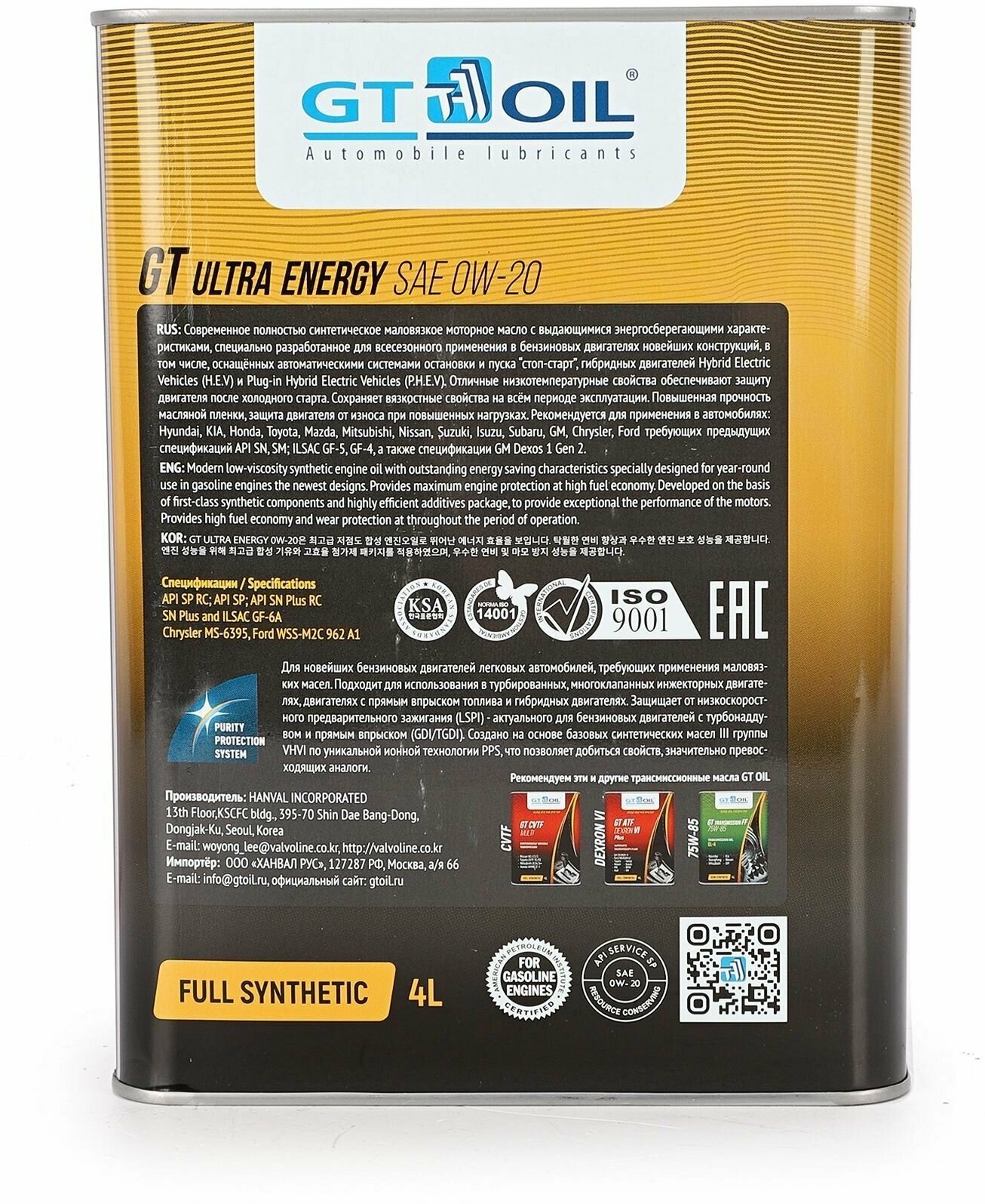 GT OIL 8809059408902 масло моторное синтетическое всесезоннное GT ULTRA ENERGY, SAE 0W-20, API SN/GF-5, 4 Л GTOIL 8809059