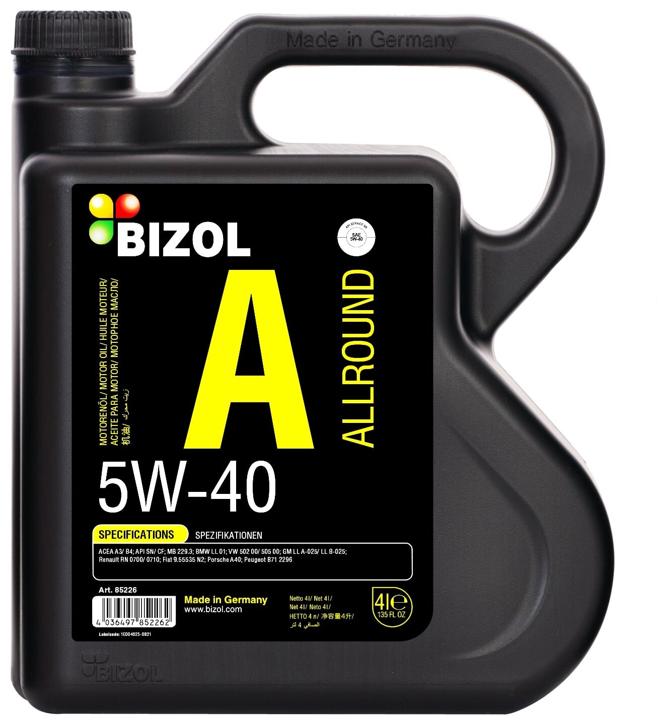 BIZOL Allround 5W-40 SN A3/B4 НС-синт. мот. масло 4л от официального дистрибьютора, производитель - BIZOL, артикул 85226