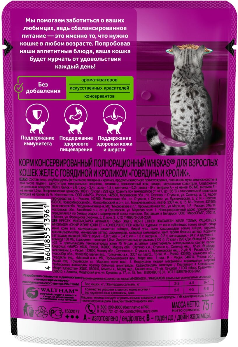 Влажный корм Whiskas для кошек, говядина/кролик, желе, 75 г
