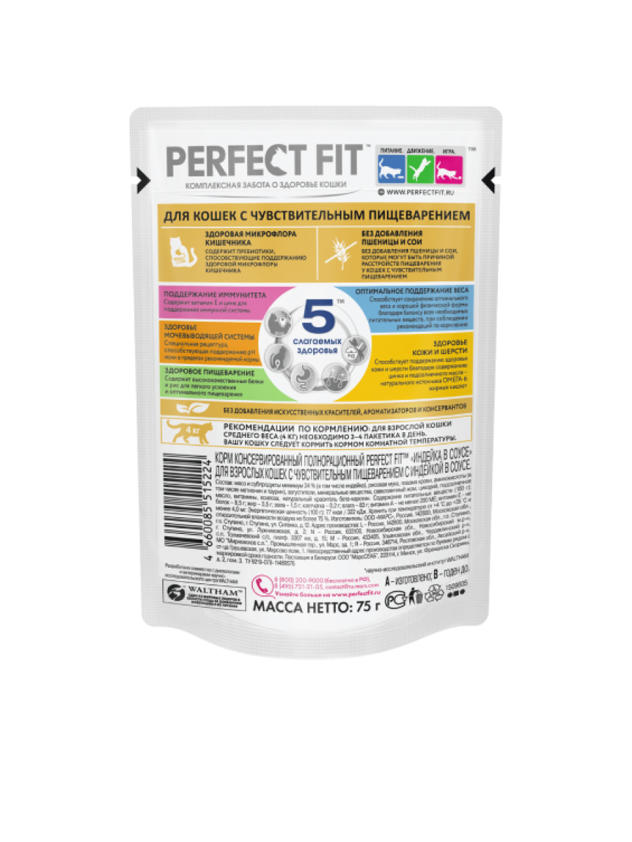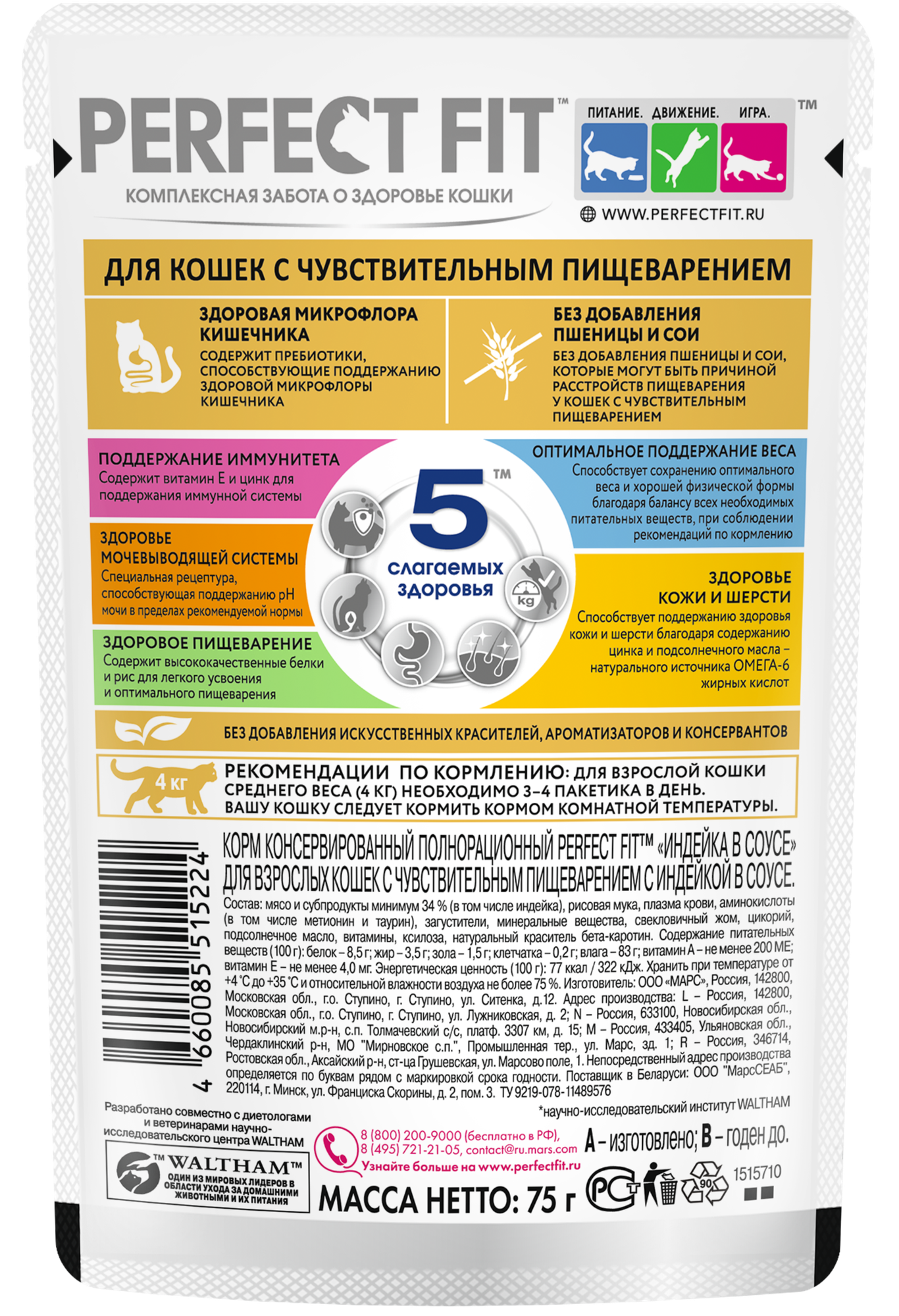 Купить Perfect Fit пауч для взрослых кошек с чувствительным пищеварением (кусочки в соусе) Индейка, 75 г. упаковка 28 шт