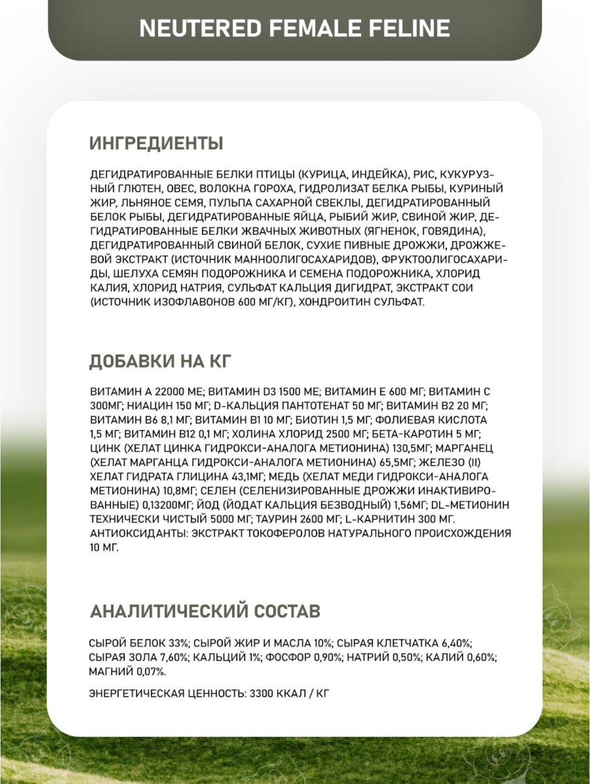 | Состав | дегидратированное куриное мясо, рис, кукурузный глютен, овес, волокна гороха, гидролизат животных белков, животный жир, льняное семя, пульпа сахарной свеклы, дегидратированная рыба, дегидратированные цельные яйца, рыбий жир, растительное масло, сухие пивные дрожжи, фруктоолигосахариды, маннанолигосахариды, подорожник, хлорид калия, хлорид натрия, сульфат кальция дигидрат, экстракт сои (источник изофлавонов 600мг/кг), хондроитин сульфат, экстракт календулы (источник лютеина) |