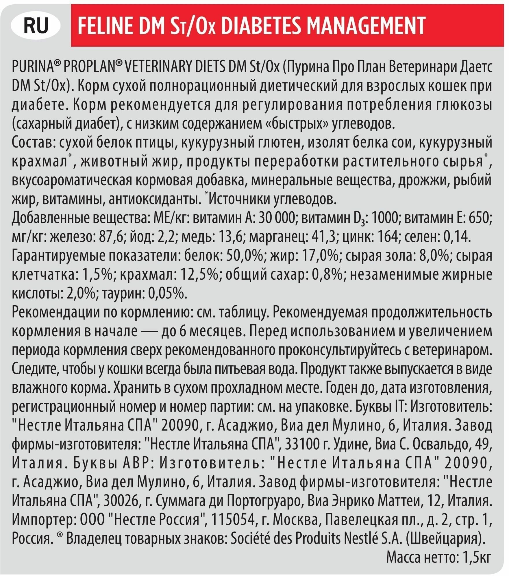 Сухой корм для кошек Purina Pro Plan Veterinary Diets DM St/Ox DIABETES MANAGEMENT, при сахарном диабете, 2 шт. х 1.5 кг