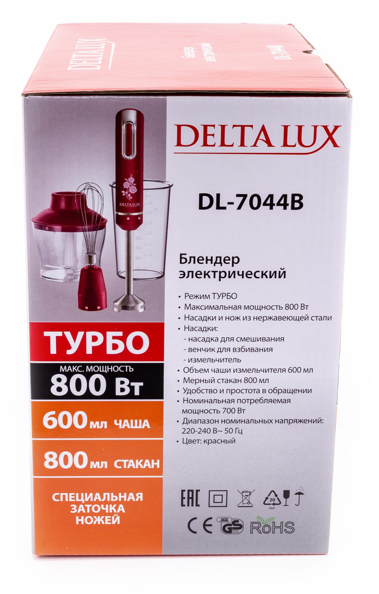 Блендер DELTA LUX DL-7044B красный: 800 Вт, регулир. скорости,"Турбо", стакан, венчик, измельч(8)