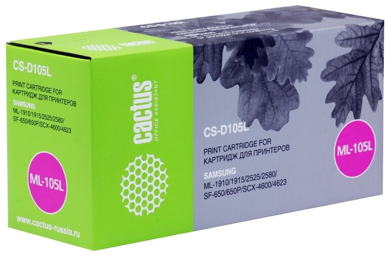 Ниже Вы можете прочитать отзывы на Картридж лазерный Cactus CS-D105L black ((2500стр.) для Samsung ML-1910/1915/2525/2580/SCX-4600/4623) (CS-D105L), ознакомится с подробными характеристиками, посмотреть интересные обзоры и фотографии на Картридж лазерный Cactus CS-D105L black ((2500стр.) для Samsung ML-1910/1915/2525/2580/SCX-4600/4623) (CS-D105L).