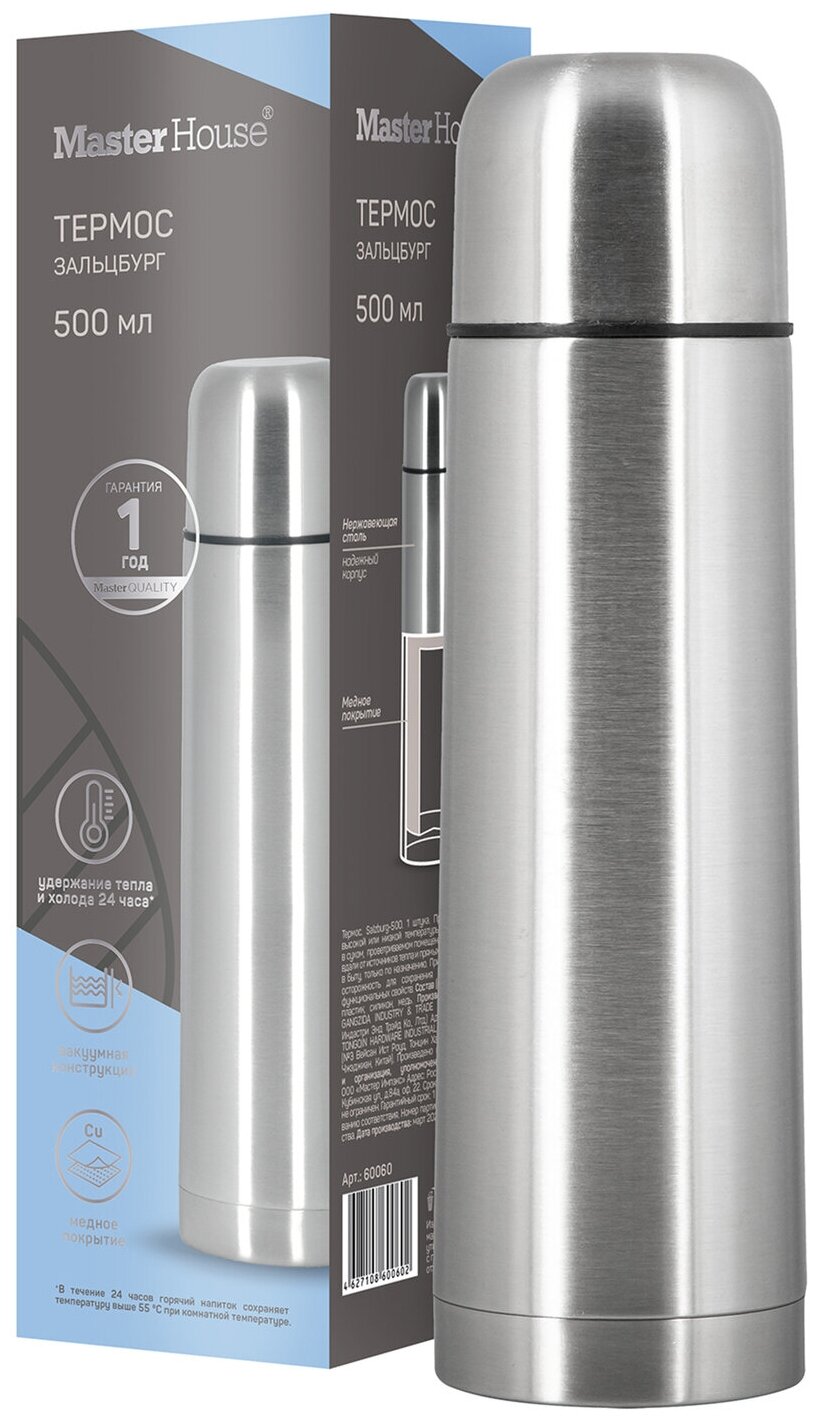 Термос Salzburg-500 узкое горло, с кнопкой, 0,5л, нерж сталь, арт.60060 Master House (арт. 542045)