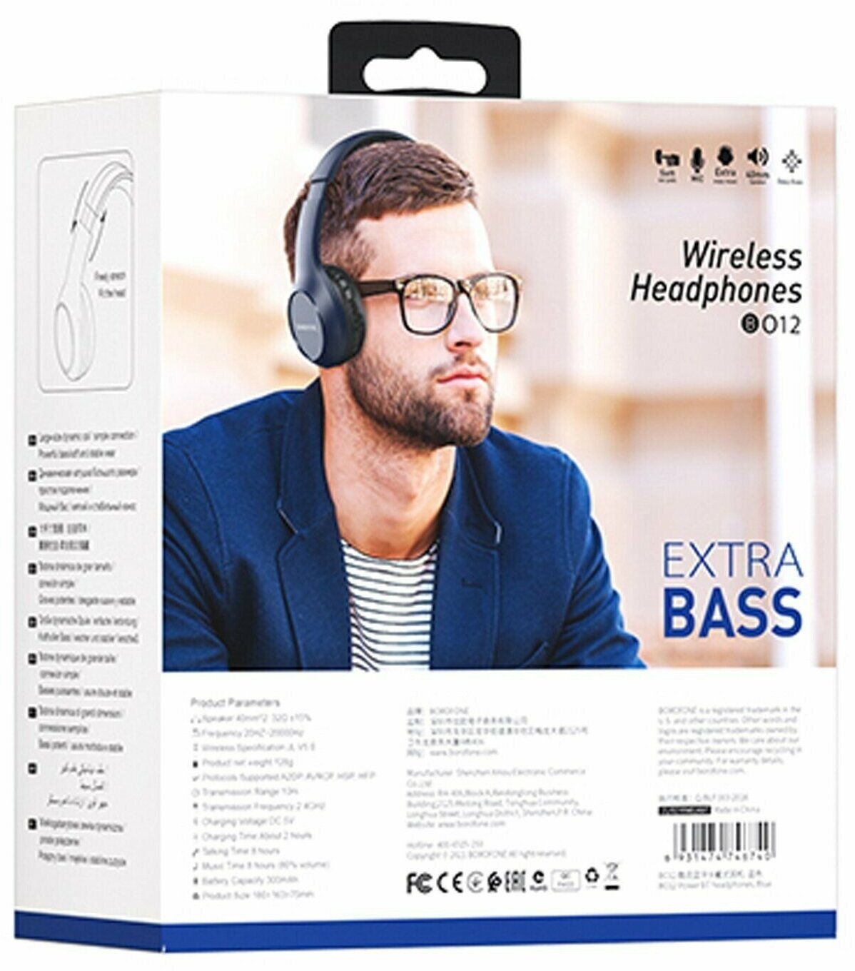 Наушники Borofone BO12 Power, беспроводные, накладные, BT5.0, AUX, 300 мАч, синие