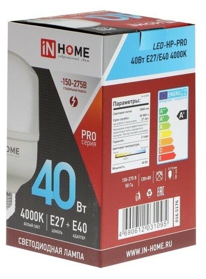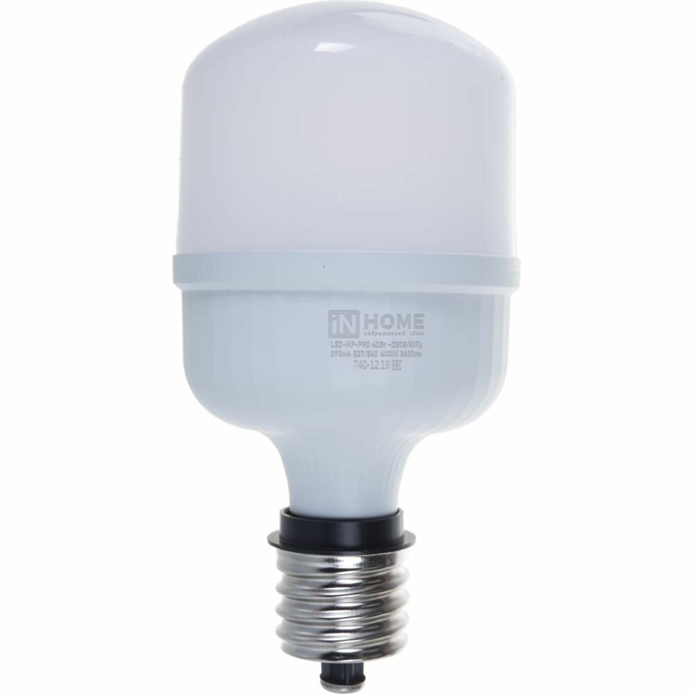 Лампа светодиодная IN HOME LED-HP-PRO, 40 Вт, 230 В, Е27, E40, 4000 К, 3800 Лм, с адаптером