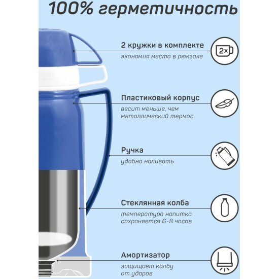 Термос/ венеция 2000мл/ Стеклянная колба/ Крышка-чашка/ Туристический/ Синий