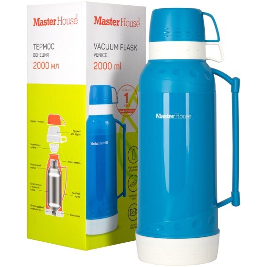 Master House Термос Венеция стекл.колба/пластик узкое горло, 2л, чашки 2шт, синий, 60271/60662 Master House