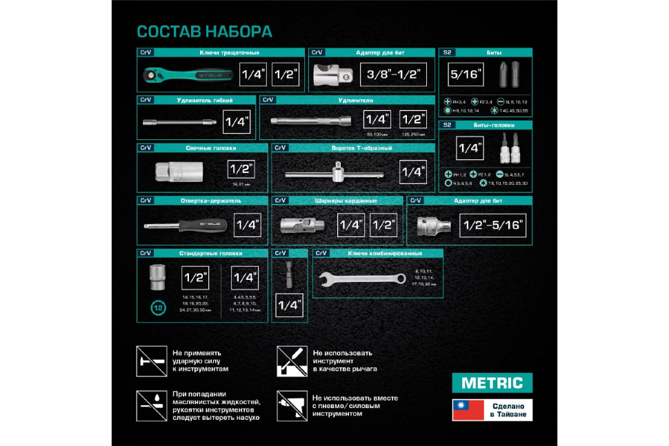 | Головки торцевые подробно | 1/2": 14, 15, 16, 17, 18, 19, 20, 22, 24, 27, 30, 32 мм; 1/4": 4, 4.5, 5, 5.5, 6, 7, 8, 9, 10, 11, 12, 13, 14 мм; свечные 1/2": 16, 21 мм; с битами 1/4": H3, H4, H5, H6, T8, T10, T15, T20, T25, T30, SL4, SL5.5, SL7, PH1, PH2, PZ1, PZ2; трещотка 1/2", 1/4"; карданный шарнир 1/2", 1/4"; удлинитель 1/2": 125, 250 мм; удлинитель 1/4": 50, 100 мм; вороток Т-образный 1/2", 1/4"; удлинитель гибкий 1/4"; держатель для бит 1/2" на 5/16" HEX |