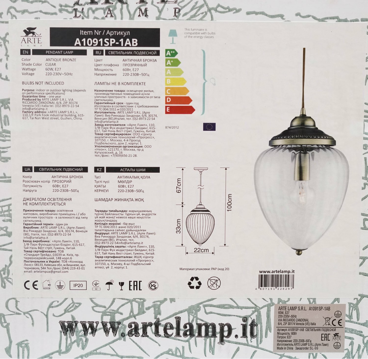 Светильник подвесной ARTE LAMP A1091SP-1AB
