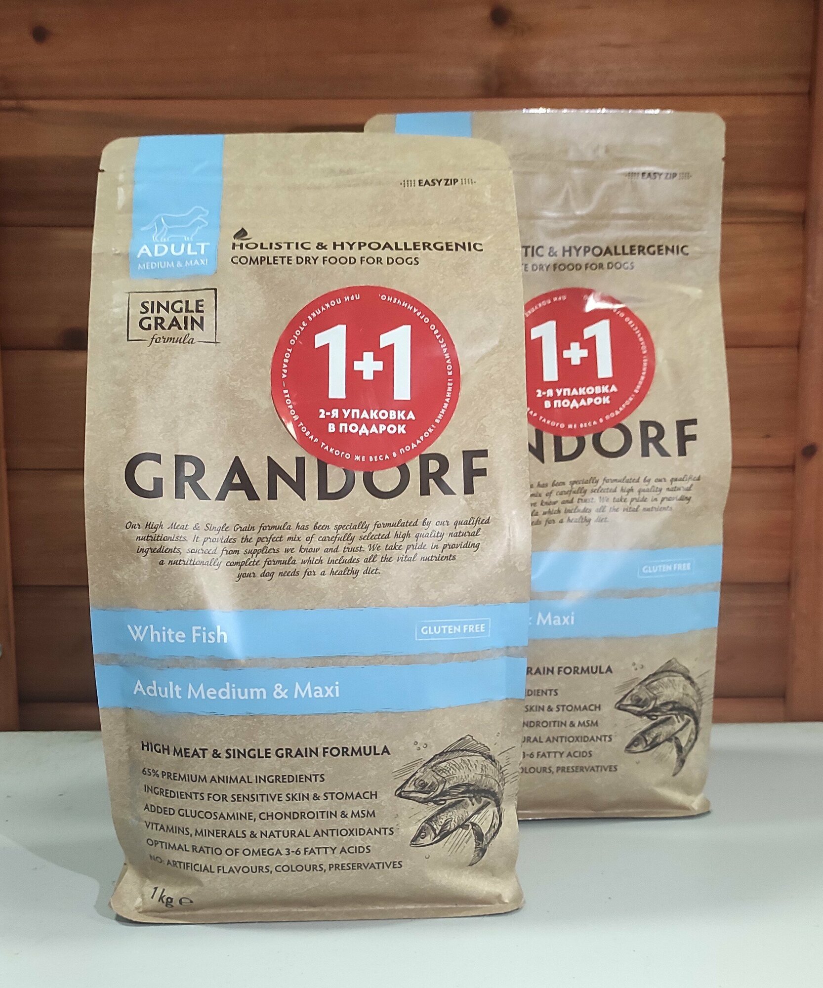GRANDORF SINGLE GRAIN DOG ADULT MEDIUM & MAXI WHITE FISH низкозерновой для взрослых собак средних и крупных пород с белой рыбой (1 кг х 6 шт)