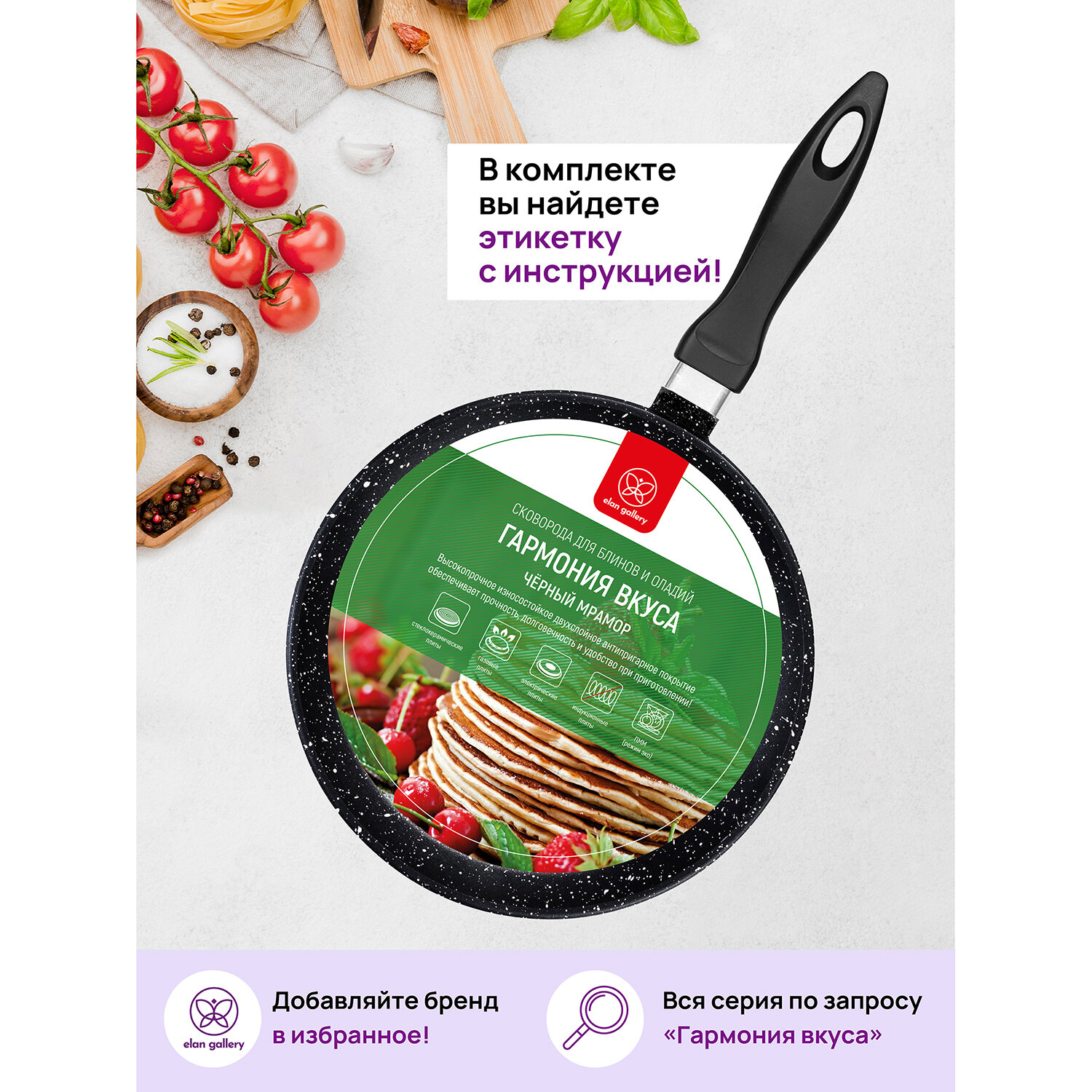 Сковорода блинная 24 см Elan Gallery 24 см гармония вкуса Черный мрамор н/р, 45*25*7,5 см интересное: