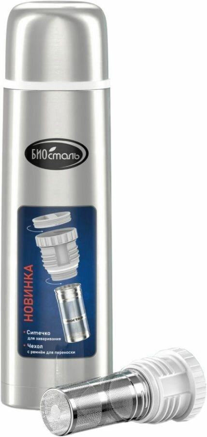 Термос классический Вакуумный с узкой горловиной, пробка-контейнер с ситичком, чехол Биосталь/Biost (1),NB-1000BZ