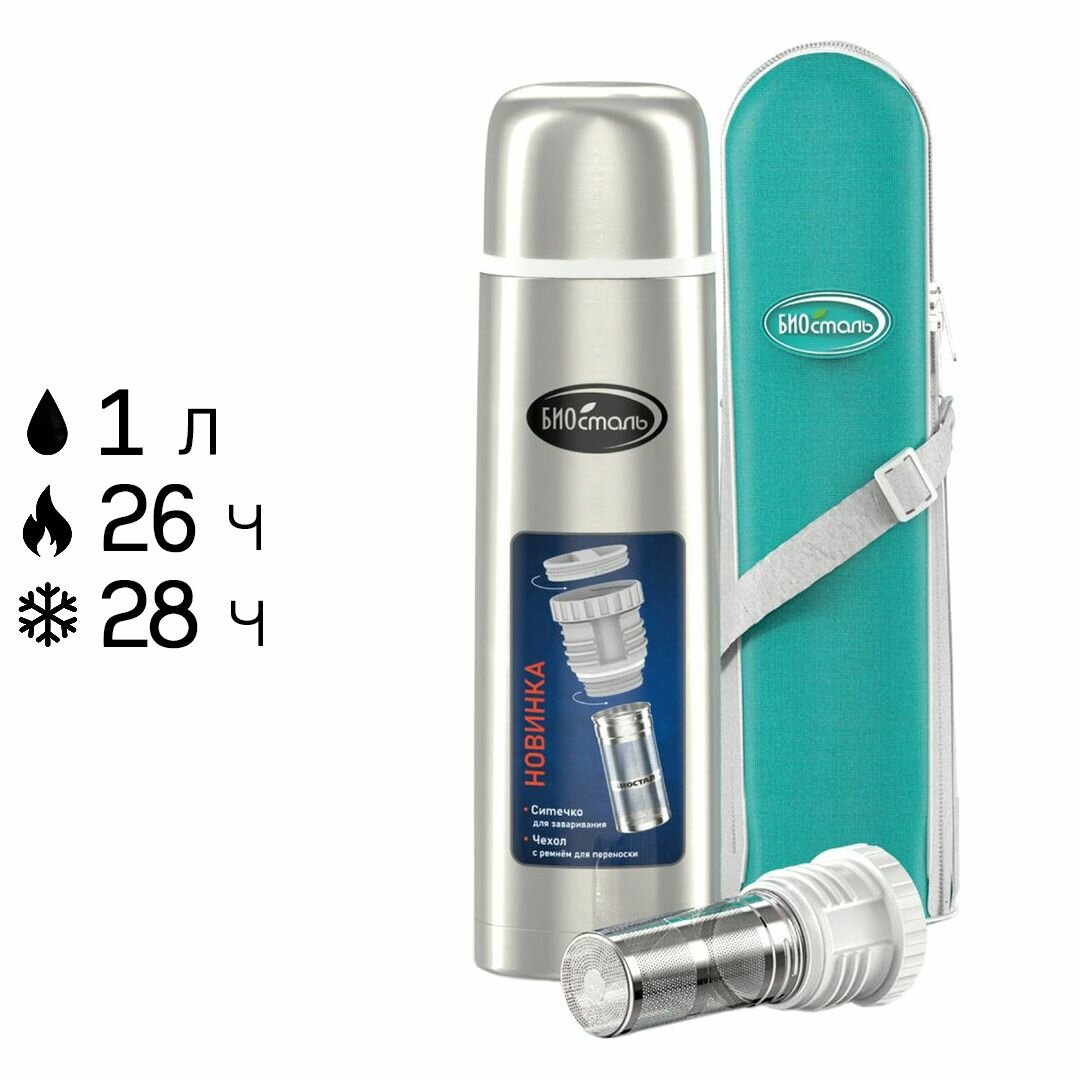Термос Biostal (1 литр), с ситечком и чехлом, стальной