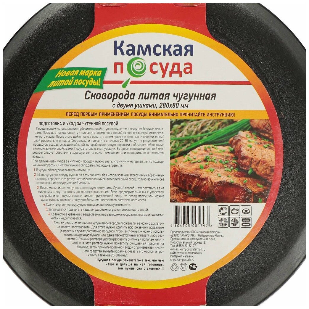 Сковорода чугун, 28 см, Камская посуда, ПЛЧ-1-28-80-05-6/у8080, индукц