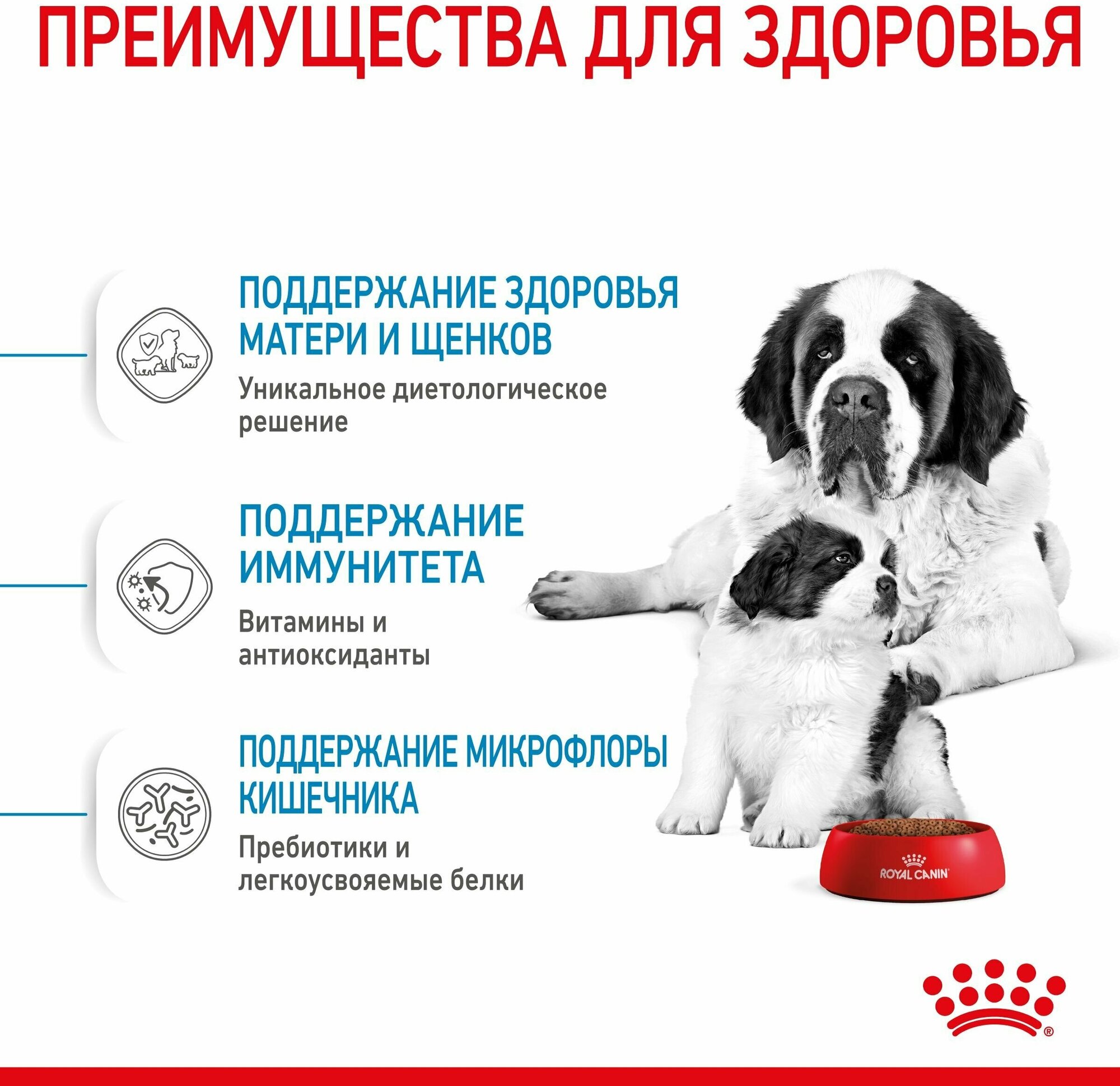 | Дополнительная информация | Start Complex/Естественные механизмы защиты: 1) здоровье пищеварительной системы: Программа Start Complex, разработанная в научных лабораториях Royal Canin, представляет собой комбинацию питательных веществ, имеющихся в сучьем молоке, усиленную дополнительными компонентами, которые обеспечивают здоровое пищеварение и укрепляют естественный иммунитет щенка; 2) поддержка в период беременности и лактации: Питательный состав адаптирован к высоким энергетическим потребностям собаки в конце беременности и в период лактации; 3) легко размачиваются: Крокеты обладают высокой вкусовой привлекательностью для собак и щенков в период отъема, а также легко размачиваются до консистенции каши, которая облегчает переход от материнского молока к твердой пище |