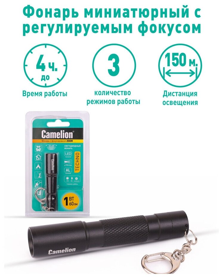 Фонарь компактный CAMELION XP-E, яркий, ZOOM, 3 режима, питание 1хAAА (не в комплекте), LED51532